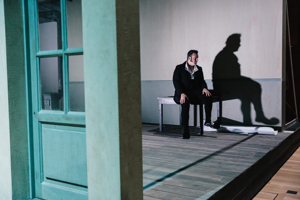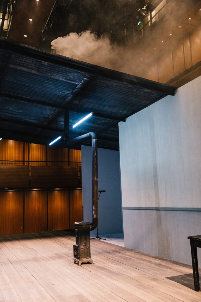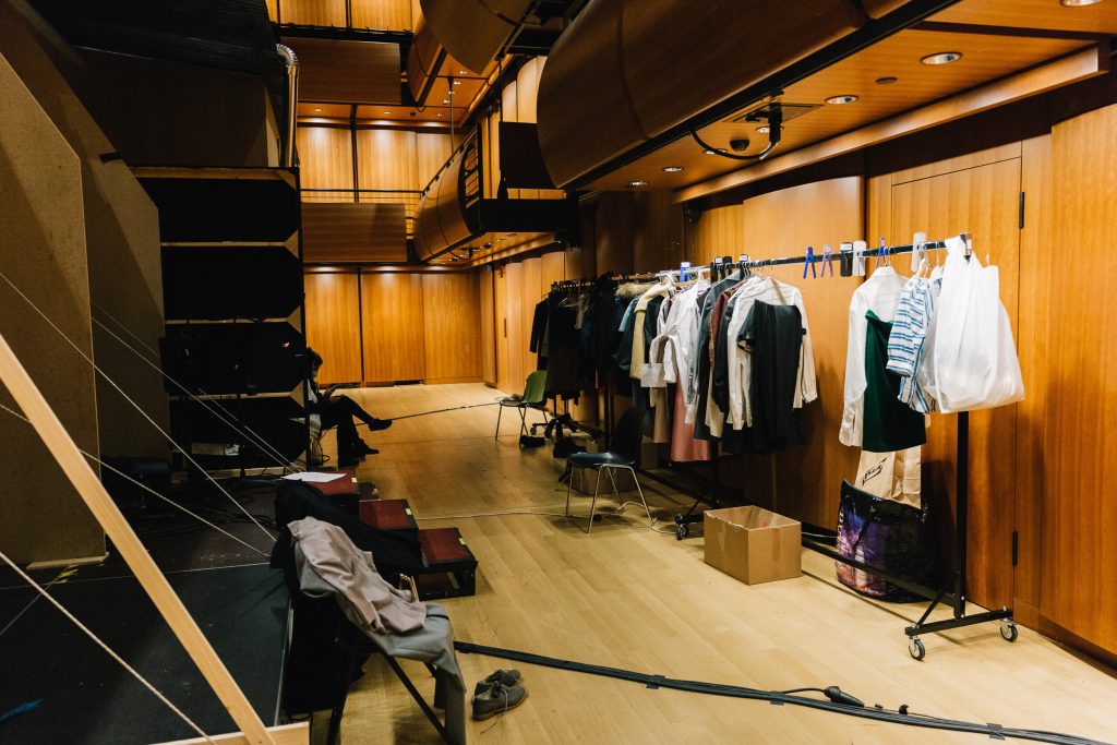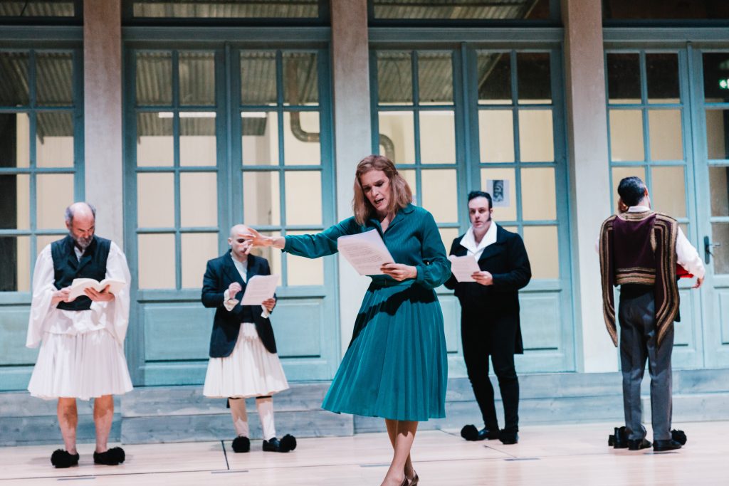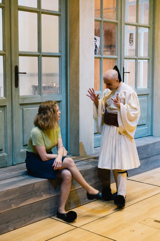 Οι μισές θέσεις της Εναλλακτικής είναι μαζεμένες ώστε η αίθουσα να παραδοθεί στα γυρίσματα, τα μικρόφωνα είναι παντού, στο πίσω μέρος είναι κρεμασμένα τα δεκάδες παραδοσιακά κοστούμια, στο πλάι βρίσκεται ένα γραφείο με βιβλία, γκραβούρες και σημειώσεις με ιστορικές αναφορές, ενώ τα μόνιτορ είναι το σημείο όπου σπεύδουν όλοι για διορθώσεις μετά τα περάσματα των σκηνών. Κάτι σαν θεατρικό VAR που θα κρίνει αν ξεκίνησε στον σωστό χρόνο η αφήγηση και το τραγούδι (τις μουσικές συνέθεσε ο Αντώνης Ανισέγκο), αν ο χορός τήρησε τις αποστάσεις, αν τα πρόσωπα και τα σώματα έχουν απαθανατιστεί από τις σωστές γωνίες, ποιο πλάνο θα βγει με σταθερή κάμερα και ποιο χρειάζεται κινούμενη και ανθρώπινο χέρι.