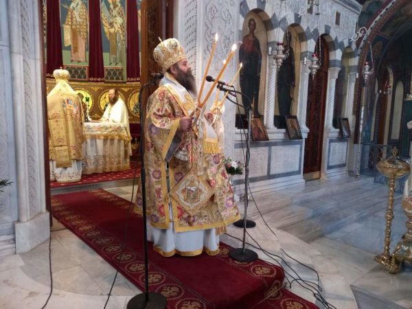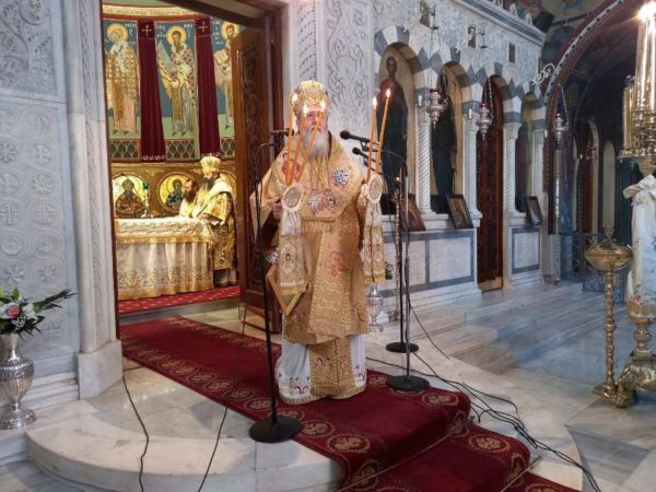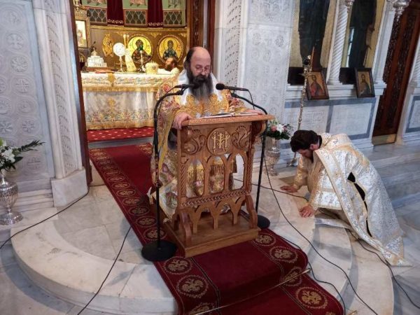 Ο Σεβασμιώτατος, στην εκκίνηση του λόγου του προς τους ευσεβείς Χριστιανούς επεσήμανε ότι, η ημέρα αυτή είναι η γενέθλιος ημέρα της Εκκλησίας μας και μέσα στη λαμπρά και πανηγυρική Θεία Λειτουργία επισυνάπτεται και ο Μέγας Εσπερινός της Γονυκλισίας.