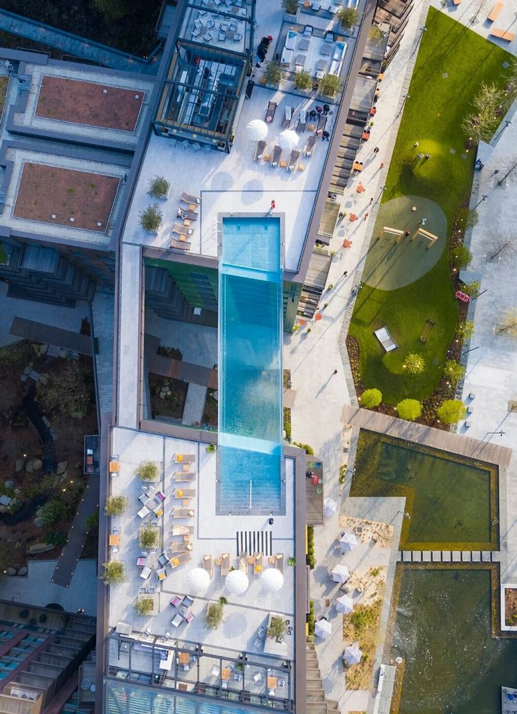 Σε ύψος 35 μέτρων από τη γη, με μήκος 25 μέτρα, η πισίνα συνδέει τις δυο πολυτελείς πολυκατοικίες στο ύψος του 10ου ορόφου ως γέφυρα και επιτρέπει στους κατοίκους να κολυμπούν ανάμεσα σε δύο κτίρια με θέα στο London Eye και στο Westminster Palace.