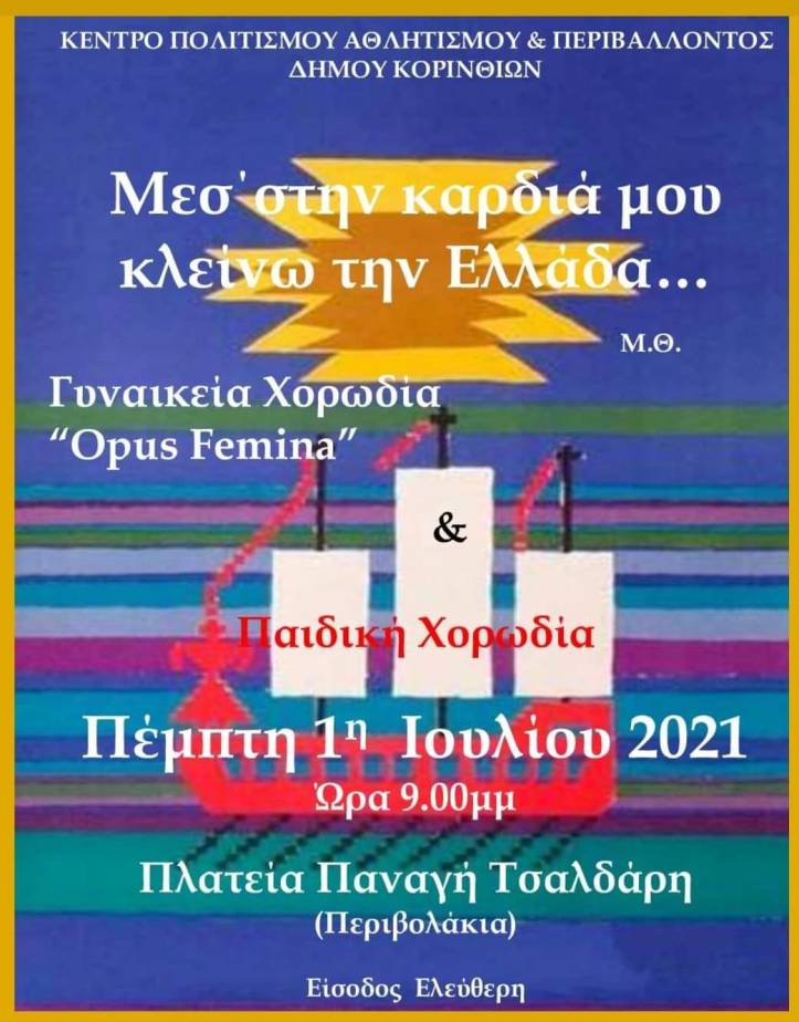 Συναυλία με τη Γυναικεία Χορωδία “Opus Femina” και την παιδική χορωδία του ΚΕ.Π.Α.Π στην πλατεία Παναγή Τσαλδάρη στην Κόρινθο
