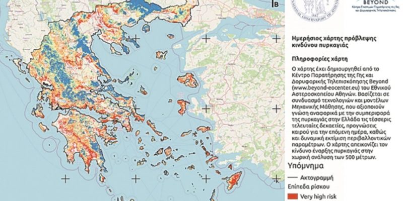 Ενα καινοτόμο σύστημα που μπορεί να προβλέψει σε ποιο σημείο αναμένεται να εκδηλωθεί πυρκαγιά στην επικράτεια το επόμενο 24ωρο με χωρική ανάλυση ακόμα και 500 μέτρων δημιούργησαν οι ερευνητές του Κέντρου Επιστημών Παρατήρησης της Γης και Δορυφορικής Παρακολούθησης Beyond του Εθνικού Αστεροσκοπείου Αθηνών. Το σύστημα παράγει καθημερινά λεπτομερείς χάρτες πρόγνωσης, αξιοποιώντας τις πιο σύγχρονες τεχνολογίες στον τομέα της δορυφορικής αποτύπωσης, ενώ οι πιλοτικές προβλέψεις του έχουν ήδη επαληθευθεί με απόλυτη επιτυχία στις πρόσφατες πυρκαγιές της Κεφαλλονιάς και των Νέων Στύρων στην Εύβοια.