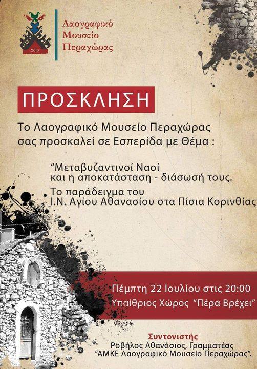 Το Λαογραφικό Μουσείο Περαχώρας σας προσκαλεί την Πέμπτη 22 Ιουλίου στις 20.00 σε Εσπερίδα με θέμα : Μεταβυζαντινοί Ναοί & η αποκατάσταση – διάσωση τους. Το παράδειγμα του Ι.Ν. Αγίου Αθανασίου στα Πίσια Κορινθίας.