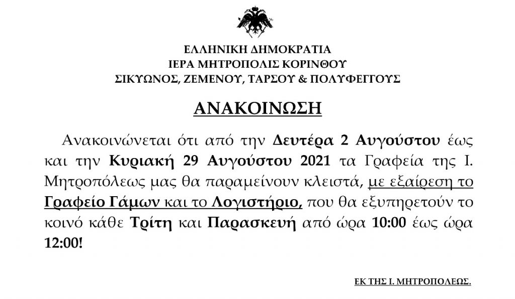 Με ανακοίνωση της η Μητρόπολη Κορίνθου γνωστοποιεί στο κοινό ότι από Δευτέρα 2 Αυγούστου τα γραφεία της θα παραμείνουν κλειστά μέχρι την Κυριακή 29 Αυγούστου εκτός του λογιστηρίου το οποίο θα εξυπηρετεί Τρίτη και Παρασκευή 10:00 με 12:00