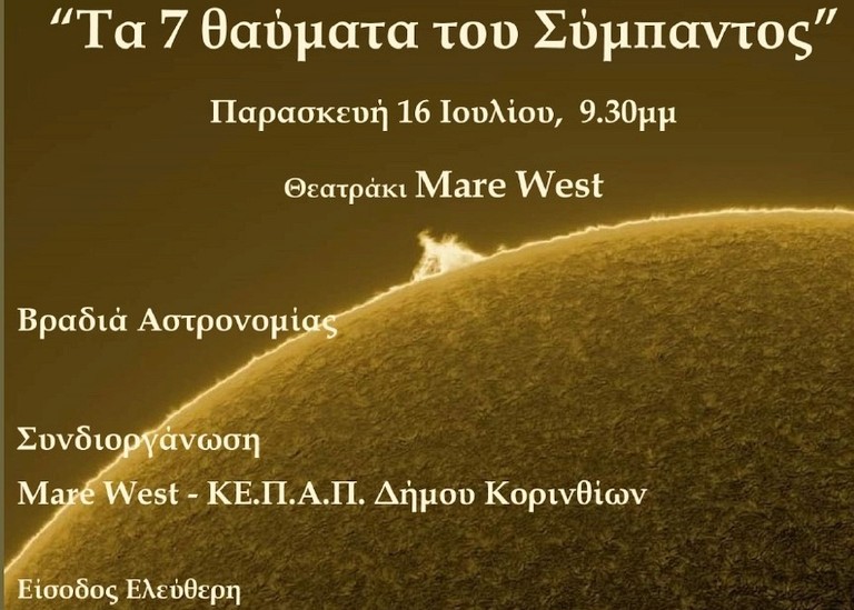 Τα 7 θαύματα του Σύμπαντος” Παρασκευή 16 Ιουλίου, 9.30μμ Υπαιθριο Θεατράκι Mare West