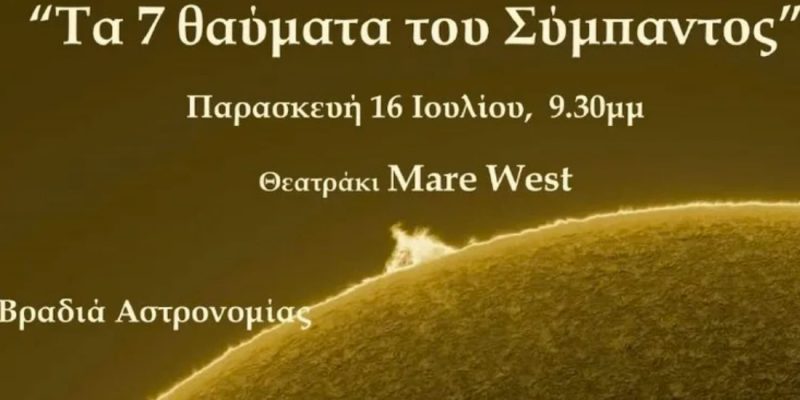 Εκδήλωση Αστρονομίας “Τα 7 θαύματα του Σύμπαντος” Παρασκευή 16 Ιουλίου, 9.30μμ Υπαιθριο Θεατράκι Mare West