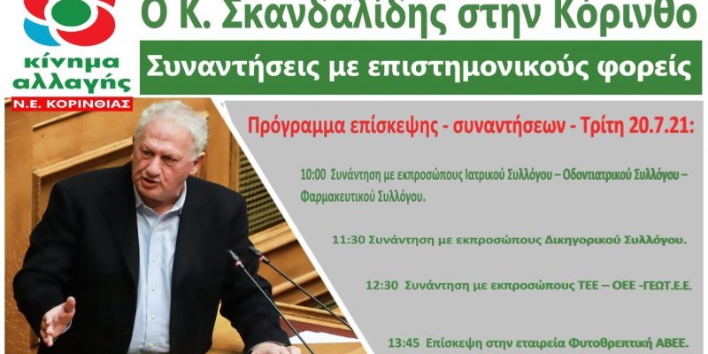 Την Τρίτη 20 Ιουλίου, κλιμάκιο του Κινήματος Αλλαγής με επικεφαλής τον Κοινοβουλευτικό Εκπρόσωπο Κώστα Σκανδαλίδη θα επισκεφτεί την Κόρινθο και θα συναντηθεί με εκπροσώπους επιμελητηρίων και επιστημονικών συλλόγων, ενώ θα επισκεφτεί και τις εγκαταστάσεις εταιρείας παραγωγής – συσκευασίας λιπασμάτων.
