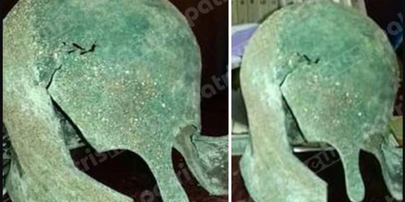 Συγκεκριμένα, η οικογένεια που βρέθηκε κοντά στις όχθες του ποταμού σε περιοχή πλησίον της Σαλμώνης για αρδευτικούς λόγους, ανακάλυψε μέσα σε καλάμια μια περικεφαλαία, της οποίας όμως το σχήμα και η όψη πολύ φυσιολογικά έχουν αλλοιωθεί ελαφρώς λόγω των πολλών χρόνων αλλά και της έκθεσης που είχε στα καιρικά φαινόμενα.