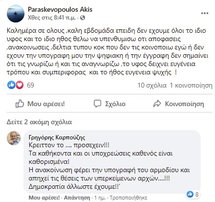 Η δημοσίευση του κ.Παρασκευόπουλου δεν πέρασε απαρατήρητη καθώς σε σχόλιο του ο κ.Καρπούζης συνιστά προσοχή και τονίζει την αρμοδιότητα της απαντήσεως.