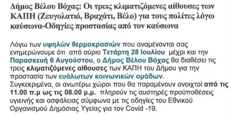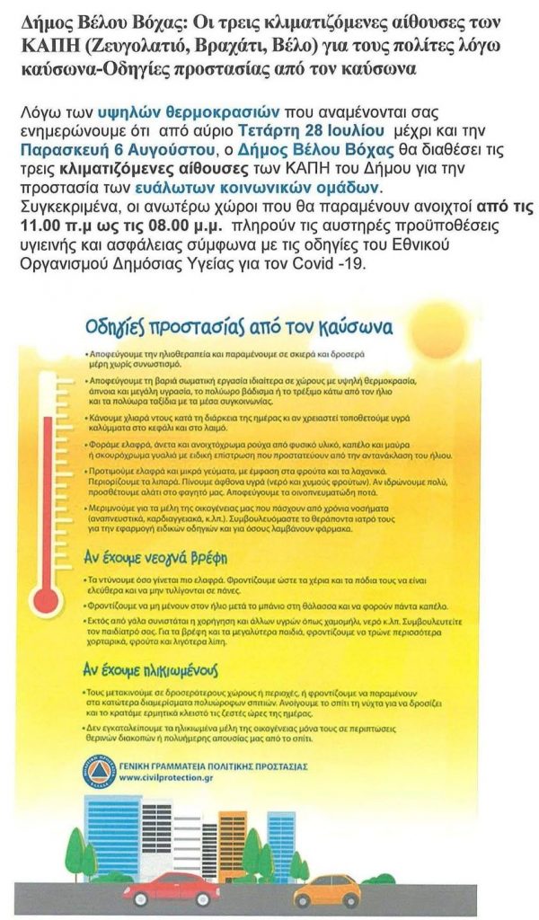 ΔΗΜΟΣ ΒΕΛΟΥ-ΒΟΧΑΣ Δήμος Βέλου Βόχας: Οι τρεις κλιματιζόμενες αίθουσες των ΚΑΠΗ για τους πολίτες λόγω καύσωνα-Οδηγίες προστασίας από τον καύσωνα By 8eCUgvCwsa 27/July/2021 ShareTweet 0