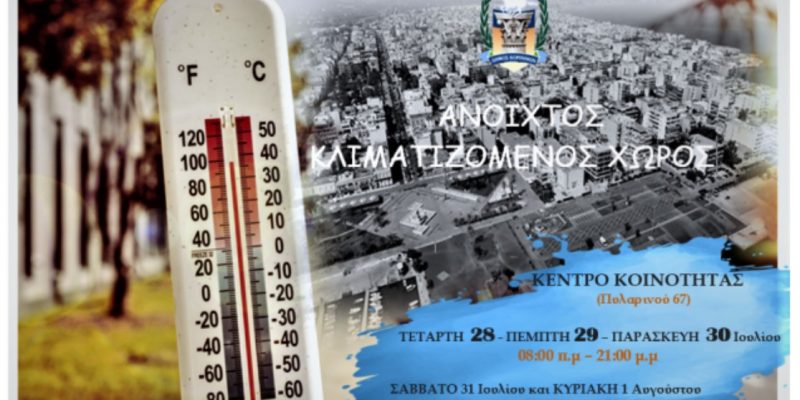 Ανοιχτό για τους πολίτες θα είναι το Κέντρο Κοινότητας του δήμου Κορινθίων τις ημέρες που, σύμφωνα με την Ε.Μ.Υ, θα σημειωθούν υψηλές θερμοκρασίες και στην περιοχή μας. Το Κέντρο βρίσκεται επι της οδού Πυλαρινού στον αριθμό 67 και θα λειτουργήσει σύμφωνα με το παρακάτω πρόγραμμα: