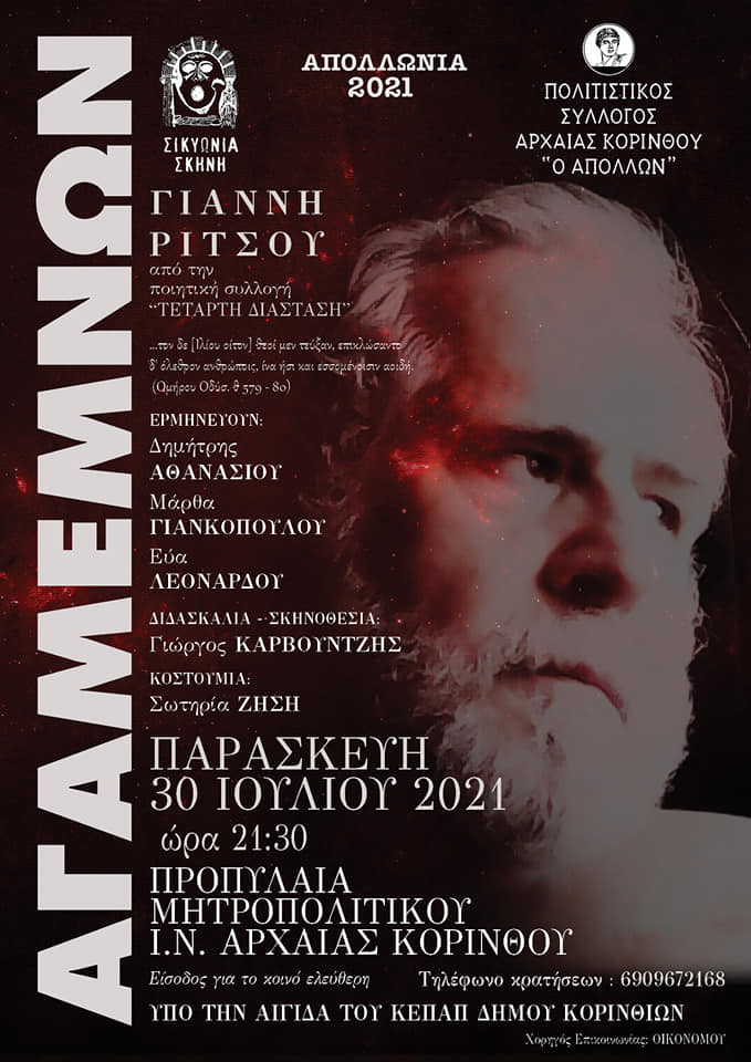 ΑΠΟΛΛΩΝΙΑ 2021. Την ΠΑΡΑΣΚΕΥΉ 30 ΙΟΥΛΙΟΥ & την ΚΥΡΙΑΚΉ 1 ΑΥΓΟΥΣΤΟΥ ,στον προαύλιο χώρο του Ιερού Ναού “Κοιμήσεως της Θεοτόκου” Αρχαίας Κορίνθου. Ώρα έναρξης:9.30μ.μ. ο Πολιτιστικός Σύλλογος Αρχαίας Κορίνθου ” Ο ΑΠΟΛΛΩΝ” διοργανώνει την θεατρική παράσταση “ΑΓΑΜΕΜΝΩΝ”