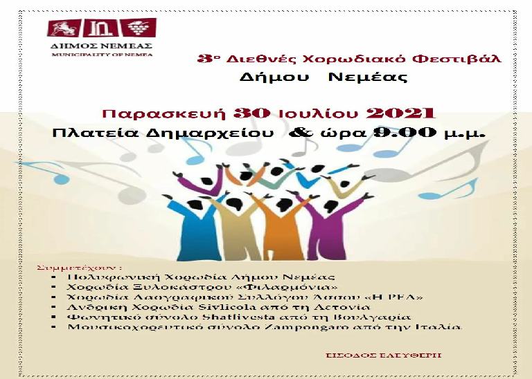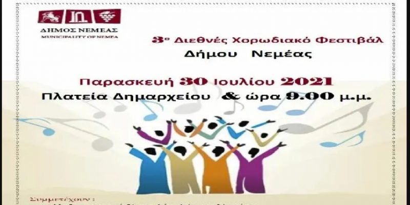 Την Παρασκευή 30 Ιουλίου στην Πλατεία Δημαρχείου και ώρα 9 το βράδυ ο δήμος Νεμέας διοργανώνει το 3ο διεθνές χορωδιακό φεστιβάλ.