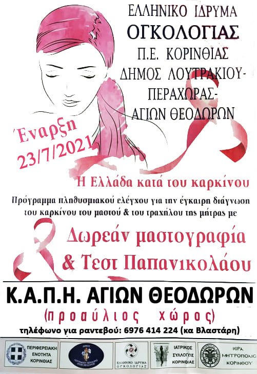 Στο πλαίσιο της δράσης διενέργειας ΔΩΡΕΑΝ εξετάσεων Μαστογραφίας και Τεστ Παπανικολάου για την πρόληψη και έγκαιρη διάγνωση του καρκίνου του μαστού και τραχήλου της μήτρας, στον γυναικείο πληθυσμό που υλοποιεί ο Δήμος Λουτρακίου – Περαχώρας – Αγίων Θεοδώρων, σας ενημερώνουμε ότι η ειδική κινητή μονάδα θα βρίσκεται από την Τρίτη 27 Ιουλίου 2021, στον προαύλιο χώρο του Κ.Α.Π.Η. Αγίων Θεοδώρων.
