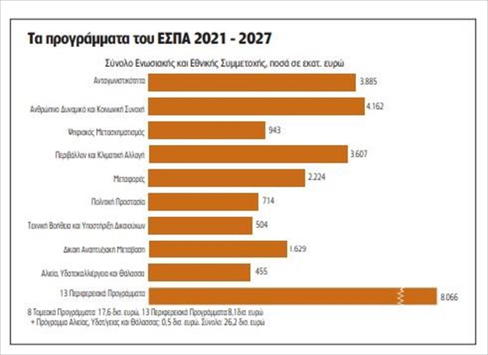 Από το σύνολο των 26,2 δισ. ευρώ, τα 20,9 δισ. ευρώ αποτελούν την ενωσιακή συνδρομή (κοινοτικά κονδύλια) και τα 5,3 δισ. ευρώ την εθνική συμμετοχή. Το νέο ΕΣΠΑ περιλαμβάνει 22 προγράμματα, εκ των οποίων τα 13 είναι περιφερειακά -ένα για κάθε περιφέρεια της χώρας- και τα 9 είναι τομεακά και θα τα διαχειρίζονται τα αρμόδια υπουργεία.