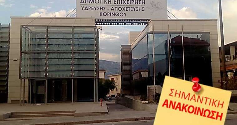Η ΔΕΥΑ Κορίνθου σας ενημερώνει ότι λόγω της μεγάλης μείωσης της παροχής νερού από τις πηγές της Στυμφαλίας και προκειμένου να αποφευχθούν οι πολύωρες διακοπές νερού, η υδροδότηση των περιοχών Λουτρών Ωρ. Ελένης, Αλμυρής, Κατακαλίου, Ρυτού, και Σοφικού θα γίνεται από νερό Στυμφαλίας και θα συμπληρώνεται από νερό γεωτρήσεων.