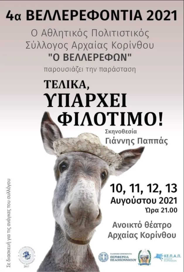 Ο ΑΘΛΗΤΙΚΟΣ ΠΟΛΙΤΙΣΤΙΚΟΣ ΣΥΛΛΟΓΟΣ ” O ΒΕΛΛΕΡΕΦΩΝ” ΑΡΧΑΙΑΣ ΚΟΡΙΝΘΟΥ ο οποίος διοργανώνει τα 4α ΒΕΛΛΕΡΕΦΟΝΤΙΑ στις 10-11-12-13 Αυγούστου 2021 στο Ανοικτό Θέατρο της Αρχαίας Κορίνθου αποφάσισε οχι μονο να ΜΗΝ ΑΝΑΒΑΛΛΕΙ τις παραστάσεις του αλλά και να προχωρήσει στην συγκέντρωση ειδών πρώτης ανάγκης για τους δοκιμαζόμενους απο τις καταστροφικές πυρκαγιές συνανθρώπους μας.