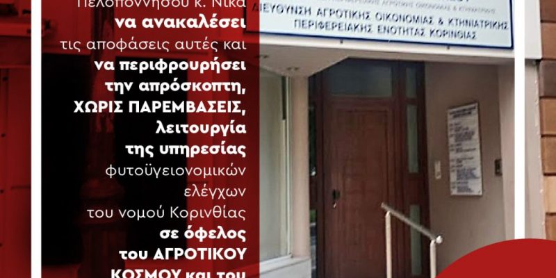 Ο ΣΥΡΙΖΑ ΠΣ Κορινθίας καλεί τον Περιφερειάρχη Πελοποννήσου κ. Νίκα να ανακαλέσει τις αποφάσεις αυτές και να περιφρουρήσει την απρόσκοπτη, χωρίς παρεμβάσεις, λειτουργία της υπηρεσίας φυτοϋγειονομικών ελέγχων του νομού Κορινθίας σε όφελος του αγροτικού κόσμου και αγροδιατροφικού τομέα.