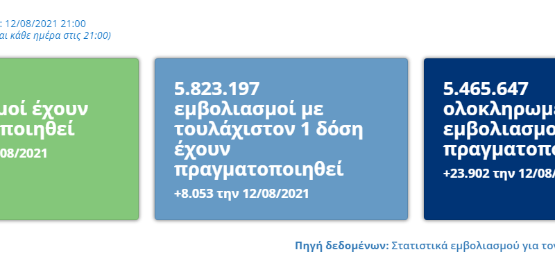-5,8 εκ. ενήλικοι πολίτες (δηλαδή 65,1% των ενηλίκων) έχουν κάνει τουλάχιστον μια δόση ή έχουν κλείσει το πρώτο τους ραντεβού και 61,1% των ενηλίκων πολιτών έχουν ολοκληρώσει τον εμβολιασμό τους.