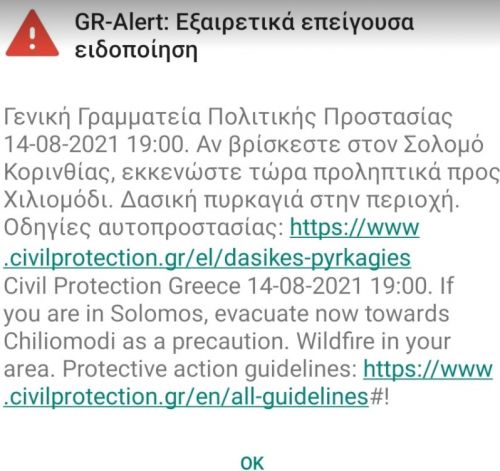 Στις 7 περίπου το απόγευμα δόθηκε εντολή εκκένωσης της κοινότητας Σολομού για προληπτικούς λόγους, ενώ λίγα λεπτά αργότερα εστάλη και μήνυμα από το 112 στους κατοίκους της περιοχής.