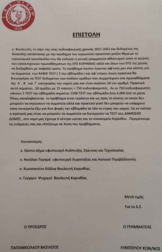 Επιστολή απέστειλε η διοίκηση του Πέλοπα Κιάτου σε όλους τους Βουλευτές του νομού στην οποία ζητά να γίνουν οι απαραίτητες ενέργειες ως προς το υγειονομικό πρωτόκολλο που θα εκδώσει η Γενική Γραμματεία Αθλητισμού με την έναρξη των πρωταθλημάτων και των τριών κατηγοριών και αφορά το κόστος των RAPID TEST αλλά και τον τρόπο διενέργειάς τους.