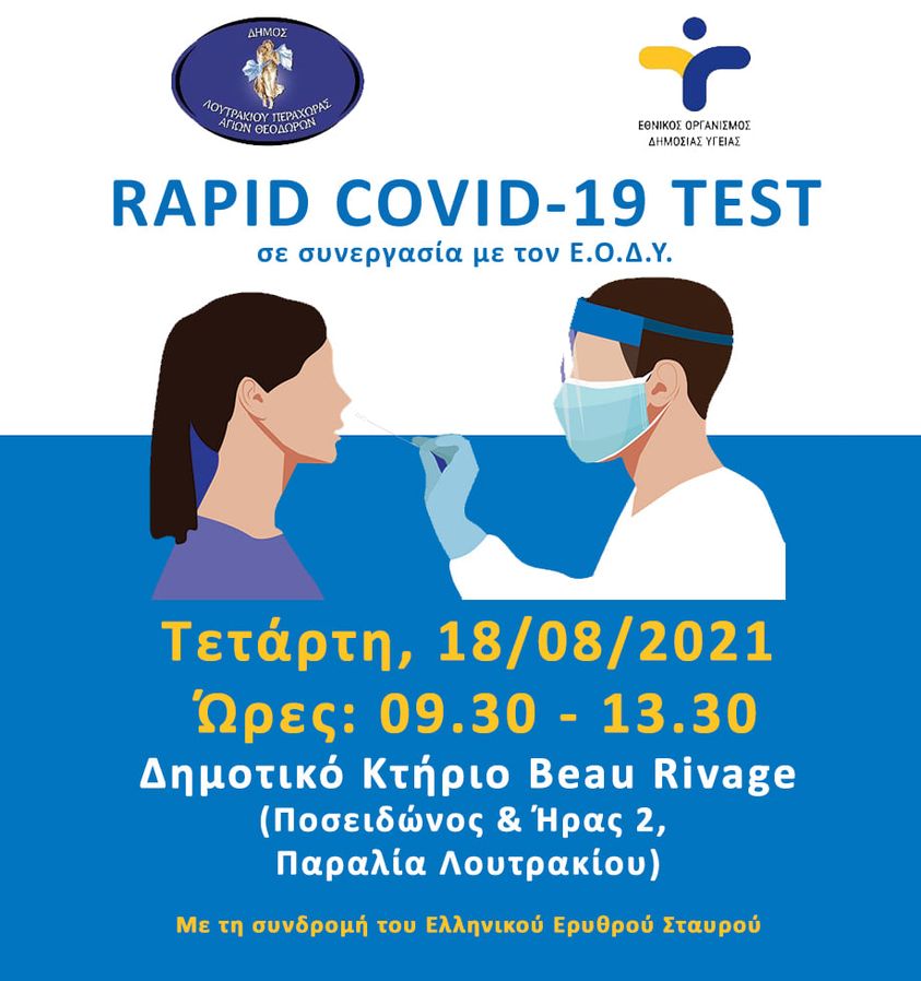 Ο Εθνικός Οργανισμός Δημόσιας Υγείας (ΕΟΔΥ) σε συνεργασία με τον Ελληνικό Ερυθρό Σταυρό – Παράρτημα Κορίνθου και τον Δήμο Λουτρακίου – Περαχώρας – Αγίων Θεοδώρων θα διεξάγει δωρεάν ελέγχους ταχείας ανίχνευσης αντιγόνου (rapid test) Covid-19.