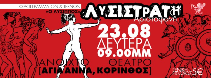Την κωμωδία “Λυσιστράτη” του Αριστοφάνη θα ανεβάσει ο Πολιτιστικός Σύλλογος Λύσιππος, στην Κόρινθο στο Ανοιχτό Θέατρο «Αγίας Άννας». Η παράσταση, σε σκηνοθεσία Παναγιώτη Μεγαρίτη και χορογραφία της Έλενας Μιχαηλίδου, θα γίνει την Τετάρτη 28 Ιουλίου, στις 9.00 το βράδυ.