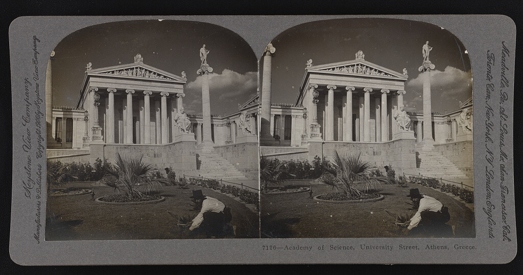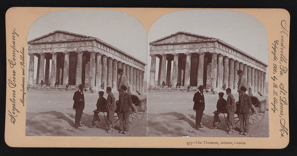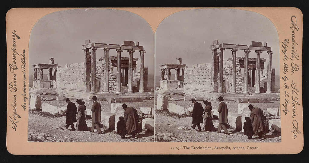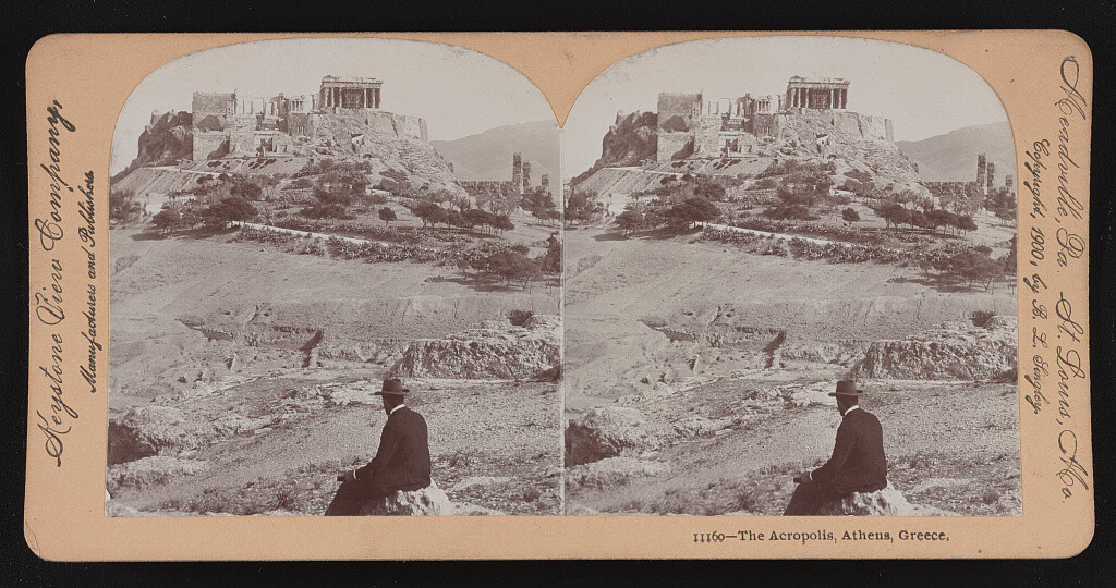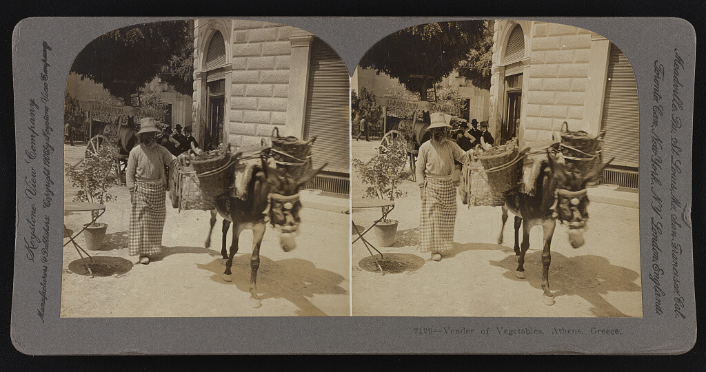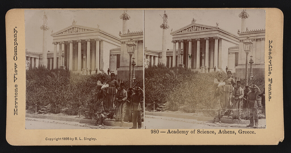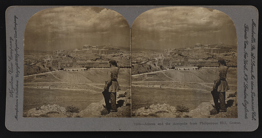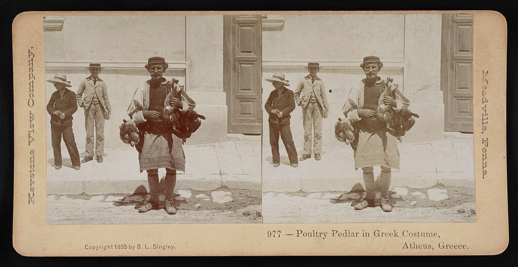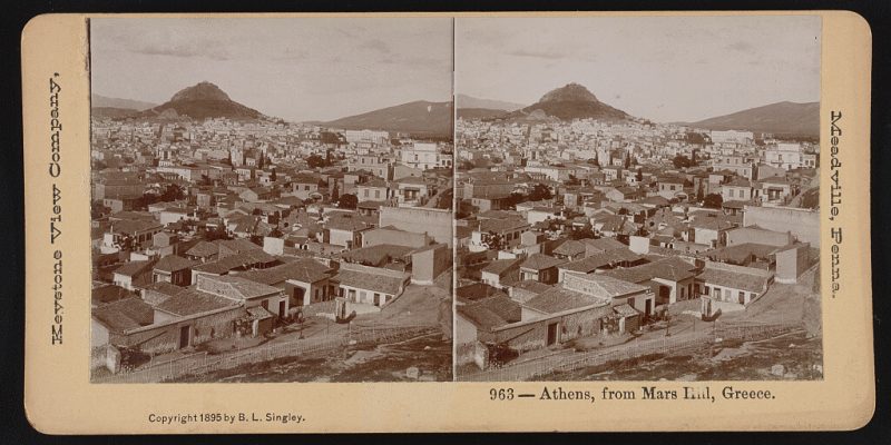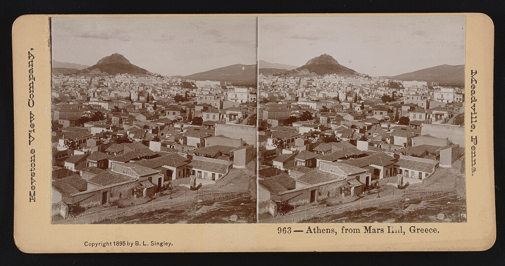Πλανόδιος πωλητής πουλερικών με παραδοσιακή φορεσιά στην Αθήνα του 1895. Φωτ.: Library of CongressΗ φωτογραφία δείχνει άντρες και αγόρια να στέκονται μπροστά από την Ακαδημία Αθηνών, σχεδιασμένη από τον βαρόνο Θεόφιλο Έντουαρντ φον Χάνσεν, μέρος της Τριλογίας του στο κέντρο της Αθήνας. Φωτ.: Library of Congress Αθήνα, 1895. Φωτ.: Library of Congress Η στήλη της Δήμητρας και της Παμφίλης στο αρχαίο νεκροταφείο στον Κεραμεικό, 1895. Φωτ.: Library of Congress Η αψίδα του Αδριανού και ο ναός του Ολυμπίου Διός, 1900. Φωτ.: Library of Congress Κοιτώντας την Ακρόπολη, 1900. Φωτ.: Library of Congress Ερέχθειο, 1900. Φωτ.: Library of Congress Πωλητής λαχανικών, 1900. Φωτ.: Library of Congress Στο μνημείο του Λυσικράτη, 1900. Φωτ.: Library of Congress Είσοδος στην Ακρόπολη, 1905. Φωτ.: Library of Congress Η Αθήνα και η Ακρόπολη από τον λόφο του Φιλοπάππου, 1906. Φωτ.: Library of Congress Το ανατολικό άκρο του Παρθενώνα, 1906. Φωτ.: Library of Congress Σε δρόμο της Αθήνας, 1906. Φωτ.: Library of Congress Στη νότια πλευρά της Ακρόπολης, 1906. Φωτ.: Library of Congress Στο Πανεπιστήμιο, 1906. Φωτ.: Library of Congress Η Αθήνα και η Ακρόπολη από τον Λυκαβηττό, 1906. Φωτ.: Library of Congress Στους Αέρηδες, 1906. Φωτ.: Library of Congress Η Πύλη της Αθηνάς στη Ρωμαϊκή Αγορά, 1906. Φωτ.: Library of Congress Η φωτογραφία δείχνει το μνημείο του Λυσικράτη, προστάτη των μουσικών παραστάσεων στο Θέατρο του Διονύσου, 1906. Φωτ.: Library of Congress Ναός του Ήφαιστου, 1906. Στο Θησείο, 1906. Φωτ.: Library of Congress Πωλητής λαχανικών με κάρο που το σέρνουν βόδια στην Αθήνα του 1906. Φωτ.: Library of Congress Γυναίκες και παιδιά μαζεμένοι σε ένα στενό δρόμο της Αθήνας, 1919. Φωτ.: Library of Congress
