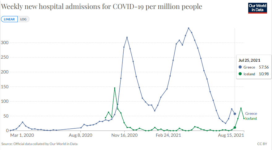 Σήμερα, στην Ισλανδία νοσηλεύονται 18 άτομα, εκ των οποίων οι τέσσερις στην εντατική. Πρόκειται για ανεμβολίαστα άτομα, από τους τελευταίους που απέμειναν εντός της χώρας.