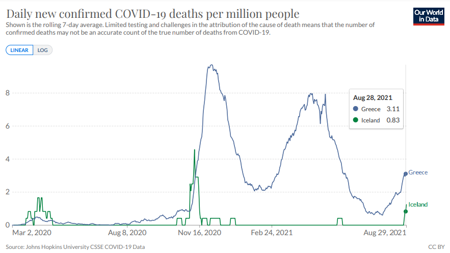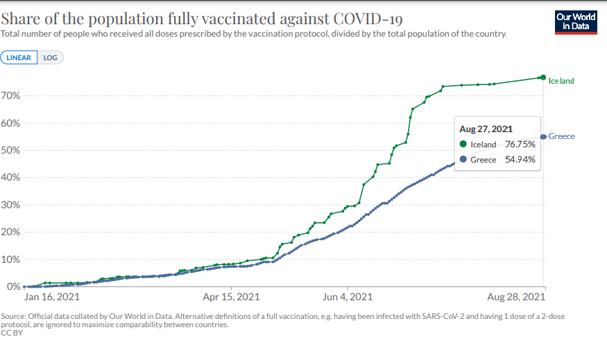 Κάπως έτσι, «μέσω» των εμβολιασμών δηλαδή, η Ισλανδία κατάφερε σχεδόν μέσα σε έναν μήνα να ελέγξει και το 4ο κύμα του κορωνοϊού, με τους πολίτες της, βεβαίως, να συνεχίζουν να τηρούν τα μέτρα. Η εξάπλωση της μετάλλαξης Δέλτα έχει πάρει εκ νέου καθοδική πορεία και τα νούμερα είναι ολοένα και πιο κάτω μέρα με τη μέρα.
