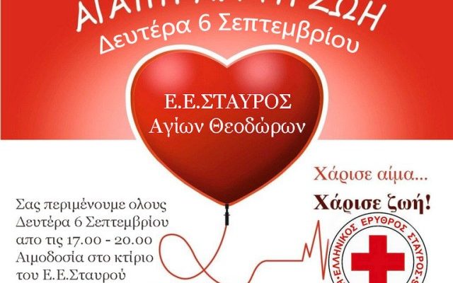 Εθελοντική Αιμοδοσία από το Παράρτημα Αγίων Θεοδώρων του Ελληνικού Ερυθρού Σταυρού ΣΗΜΕΡΑ 16.00 – 19.00