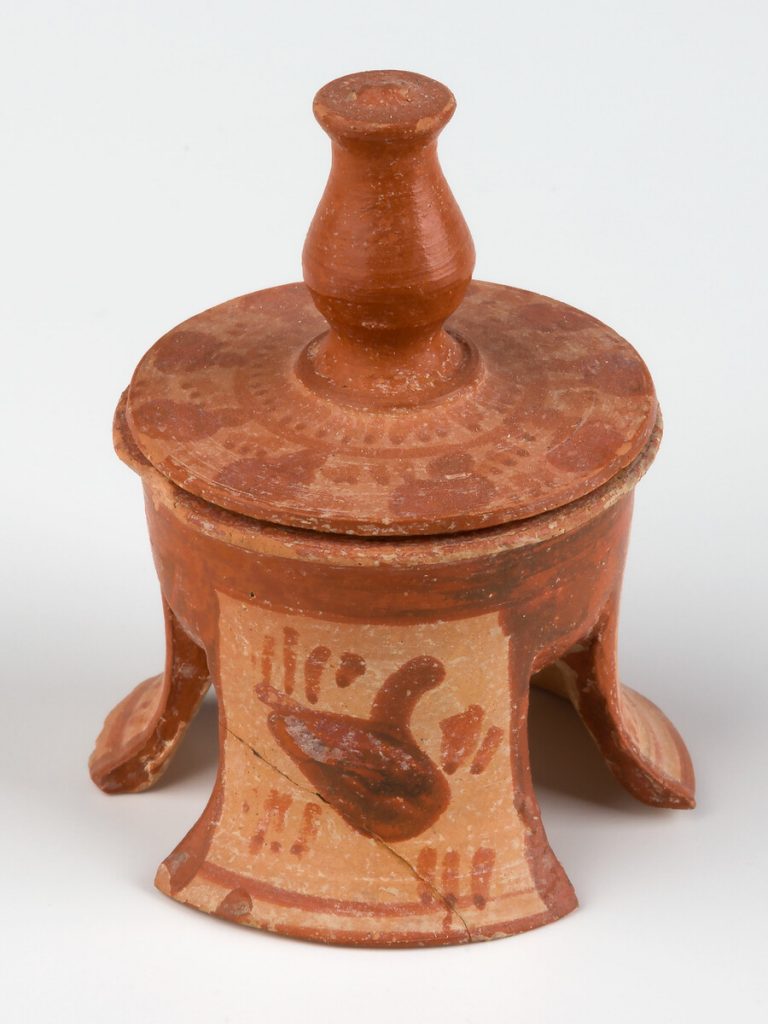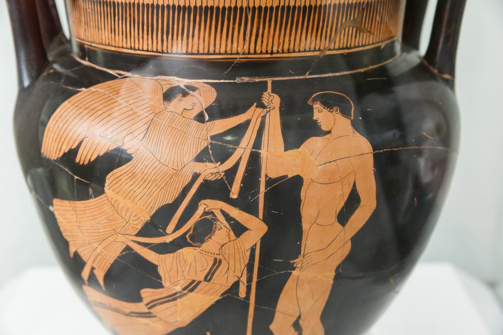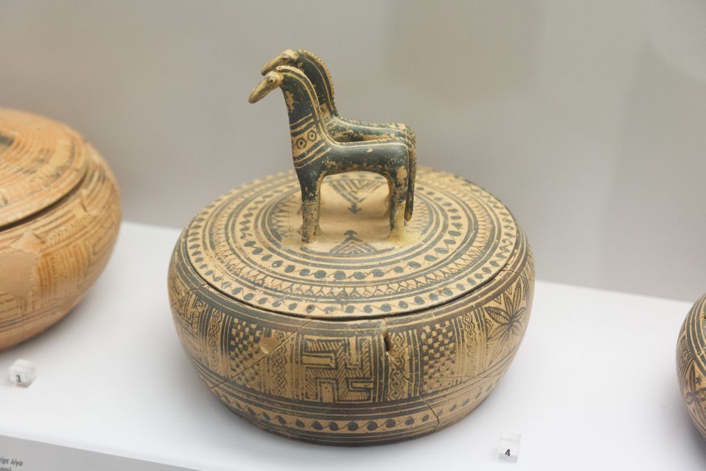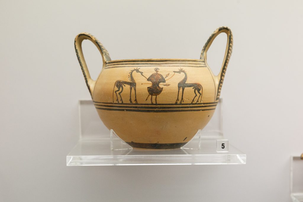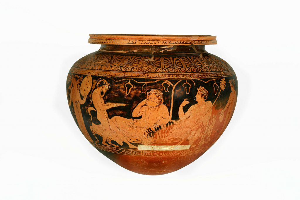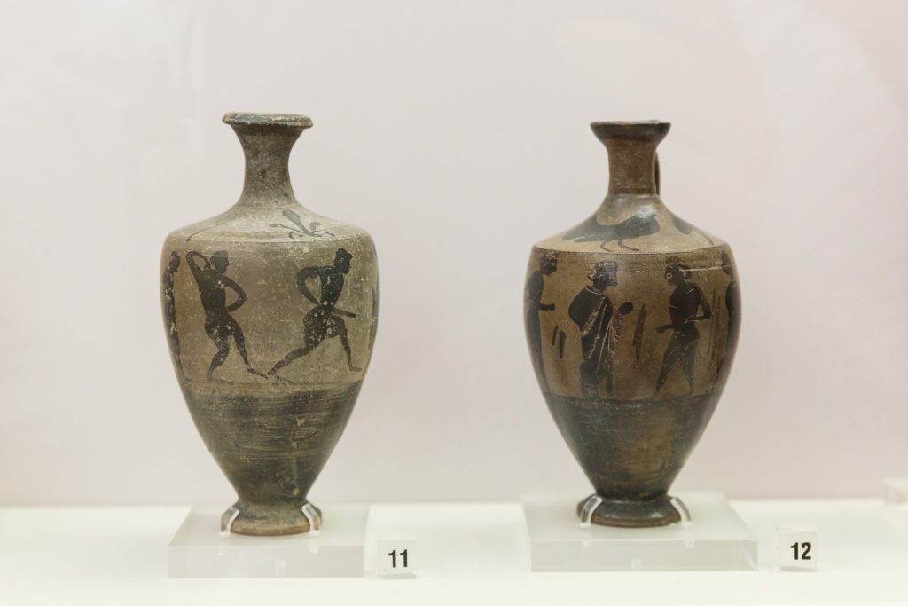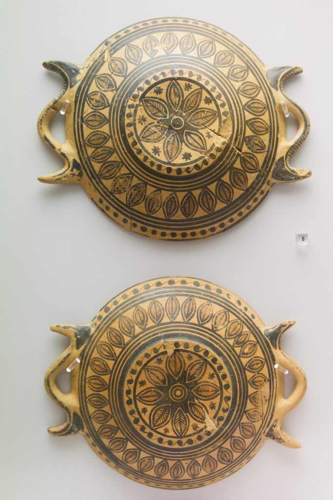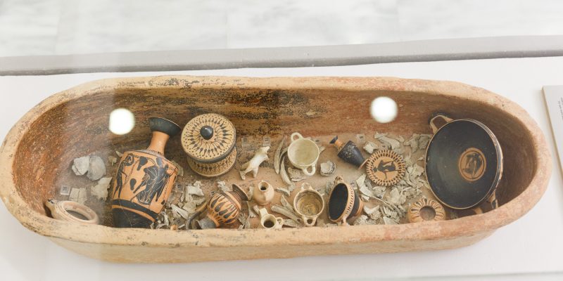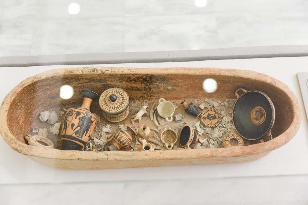 Ο ταφικός περίβολος εκατέρωθεν έδωσε πλήθος ταφών (375 έχουν εντοπιστεί ως τώρα) και αναθημάτων, κυρίως αγγείων, φθαρμένα τα περισσότερα, καθώς προέρχονταν από πυρές, και κάποια ιδιαίτερα κομμάτια, όπως ένας θαυμάσιος ερυθρόμορφος λέβητας (δίνος) που ταξίδεψε το ’18 στη Νέα Υόρκη για την έκθεση «Emotions» του Ιδρύματος Ωνάση και το ’19 στη Σεούλ για την έκθεση «The Greeks» για να επιστρέψει, προσώρας, στην αποθήκη της Συλλογής. Απεικονίζει τον Διόνυσο και τον Ηρακλή σε νεαρή ηλικία να κρασοπίνουν στη διάρκεια συμποσίου ‒ τους σερβίρουν Σάτυροι που παίζουν αυλό συνοδευόμενοι από Μαινάδες με τύμπανα.