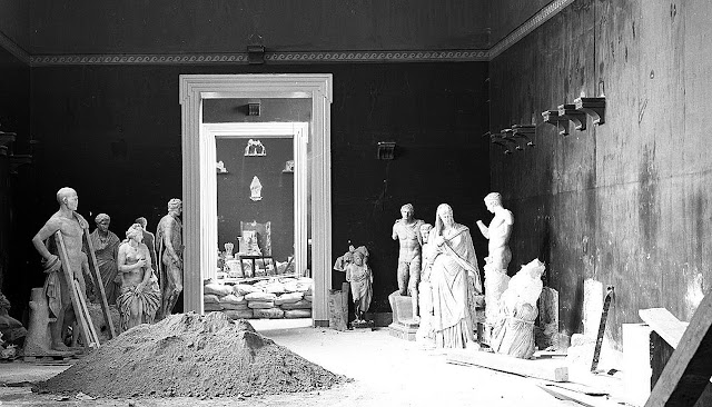 Οι άνθρωποι του Εθνικού Αρχαιολογικού Μουσείου (ΕΑΜ) εργάζονταν με αυτοθυσία, αυταπάρνηση και ομαδική συνεργασία. Μαρμάρινα αγάλματα όπως ο Ποσειδώνας από τη Μήλο, ο κούρος από το Σούνιο, δύο θρόνοι του 4ου αι. π.Χ., από τον μικρό ναό του Ραμνούντα, ευρήματα από τη Δήλο, το μαρμάρινο σύμπλεγμα της Αφροδίτης, του Πάνα και του Ερωτα, και πολλά ακόμη απομακρύνθηκαν από τις αίθουσες και καταχώθηκαν κάτω από τα δάπεδα, όσο πιο βαθιά μπορούσαν να τα θάψουν και να σκεπαστούν με άμμο.