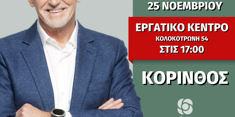 Την Πέμπτη 25 Νοεμβρίου στις 17:00, ο υποψήφιος Πρόεδρος του Κινήματος Αλλαγής, Βουλευτής Αχαΐας και πρώην Πρωθυπουργός Γιώργος Παπανδρέου θα επισκεφτεί την Κόρινθο και θα πραγματοποιήσει ομιλία στο Εργατοϋπαλληλικό Κέντρο Κορίνθου (Κολοκοτρώνη 54- Κόρινθος).