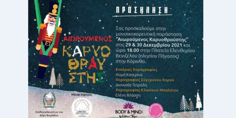 29 και 30 Δεκεμβρίου 3 Κορίνθιες χορογράφοι, η Έλενα Βλάσση, η Διονυσία Τετράδη και η Κατερίνα Θυμή παρουσιάζουν μια ξεχωριστή παράσταση που συνδυάζει κλασσικό μπαλέτο, εναέρια χορογραφία και σύγχρονο χορό στην Πλατεία Ελ. Βενιζέλου στην Κόρινθο.
