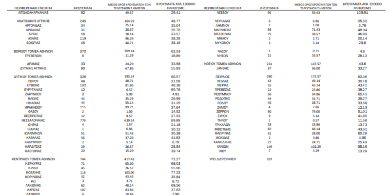 Γεωγραφική διασπορά: Ο χάρτης αποτυπώνει τη γεωγραφική κατανομή των συνολικών κρουσμάτων COVID-19 (από την αρχή της επιδημίας) ανά Περιφερειακή Ενότητα της χώρας, με βάση την δηλωθείσα διεύθυνση μόνιμης κατοικίας του ασθενούς, ή τη διεύθυνση προσωρινής διαμονής για τους τουρίστες και άλλους προσωρινά διαμένοντες στην Ελλάδα. Συμπεριλαμβάνονται τόσο κρούσματα με ιστορικό ταξιδίου (“εισαγόμενα”) όσο και κρούσματα με πιθανή εγχώρια μετάδοση