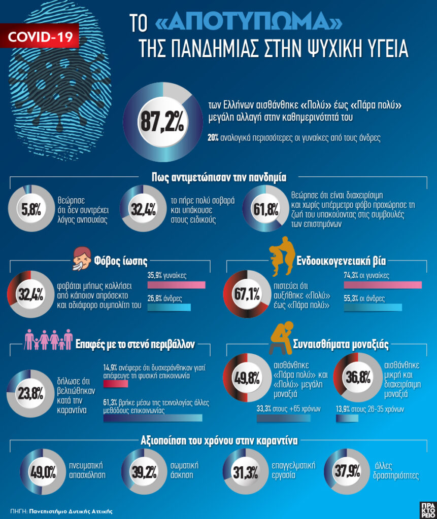 Σύμφωνα με την πρόσφατη έρευνα «Η Covid-19 στην Ελλάδα: Ψυχολογικό Αποτύπωμα» του Πανεπιστημίου Δυτικής Αττικής, τα στοιχεία της έρευνας δείχνουν πως σχεδόν το σύνολο των ανθρώπων στην Ελλάδα αισθάνθηκαν σημαντική αλλαγή στην καθημερινότητά τους.