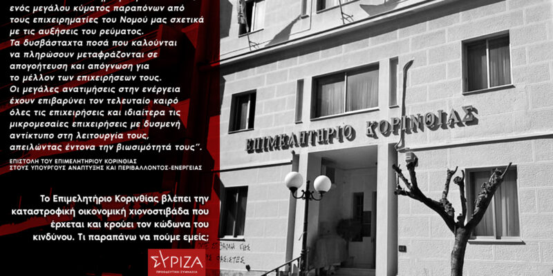 Την ζοφερή κατάσταση στην οποία έχουν περιέλθει οι ΜμΕ της χώρας περιγράφει ανακοίνωση του ΣΥΡΙΖΑ – Προοδευτική Συμμαχία κορινθίας, στην οποία μάλιστα γίνεται επίκληση της ανοιχτής επιστολής που έστειλε το Επιμελητήριο Κορινθίας στην κυβέρνηση.