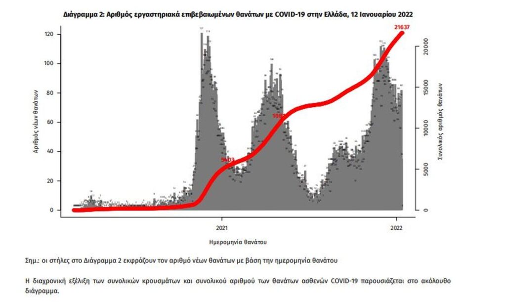 Οι νέοι θάνατοι ασθενών με COVID-19 είναι 77, ενώ από την έναρξη της επιδημίας έχουν καταγραφεί συνολικά 21.637 θάνατοι. Το 95.1% είχε υποκείμενο νόσημα ή/και ηλικία 70 ετών και άνω.