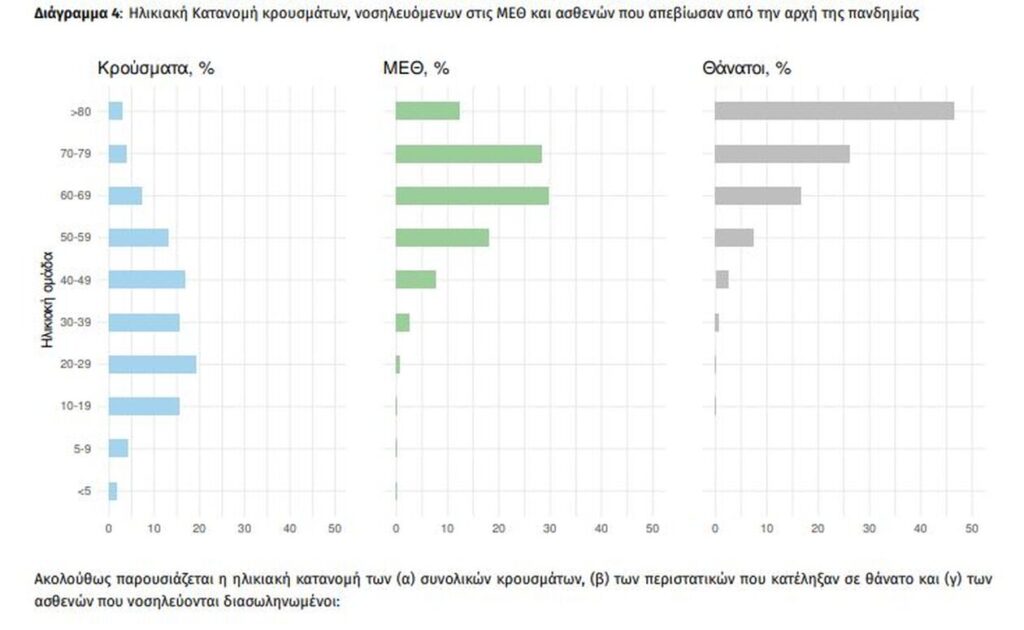 Οι εισαγωγές νέων ασθενών Covid-19 στα νοσοκομεία της επικράτειας είναι 654 (ημερήσια μεταβολή +31.59%). Ο μέσος όρος εισαγωγών του επταημέρου είναι 578 ασθενείς. Η διάμεση ηλικία των κρουσμάτων είναι 36 έτη (εύρος 0.2 έως 106 έτη), ενώ η διάμεση ηλικία των θανόντων είναι 78 έτη (εύρος 0.2 έως 106 έτη)».