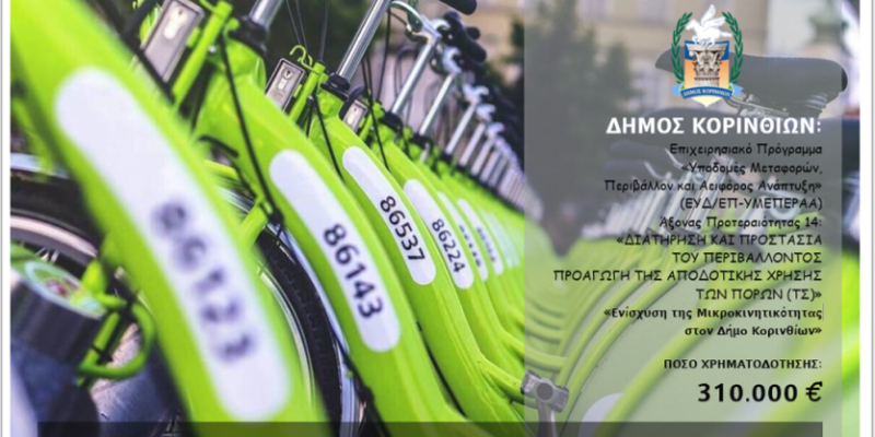 Την ηλεκτροκίνηση στη ζωή των Κορινθίων εισάγει ο Δήμος Κορινθίων με την δημιουργία ολοκληρωμένου, κοινόχρηστου, δικτύου ηλεκτρικών ποδηλάτων.