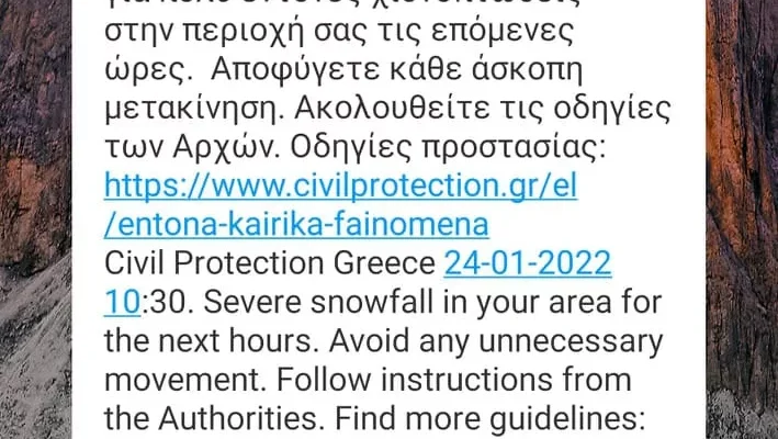 Το μήνυμα προειδοποιεί για πολύ έντονες χιονοπτώσεις στην περιοχή τις επόμενες ώρες. Καλεί τους πολίτες να αποφύγουν κάθε άσκοπη μετακίνηση και να ακολουθήσουν τις οδηγίες των Αρχών.