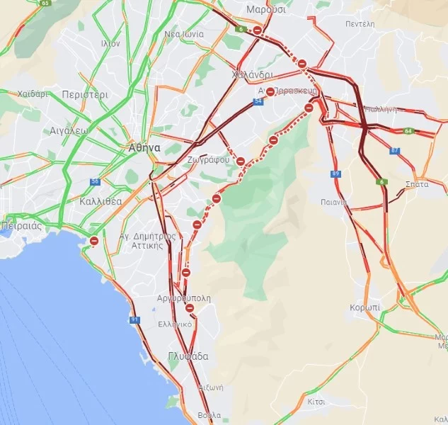 Μεγάλα προβλήματα εντοπίζονται και στη Βασιλίσσης Σοφίας, στη λεωφόρο Κηφισίας από το Δαχτυλίδι και μετά, στη λεωφόρο Μεσογείων, στη λεωφόρο Μαραθώνος, στη λεωφόρο Διονύσου, στην Αττική Οδό και την Αθηνών-Λαμίας. Σε πολύ μεγάλα κομμάτια των συγκεκριμένων δρόμων τα αυτοκίνητα πηγαίνουν σημειωτόν. Προβλήματα παρατηρούνται, επίσης, στην οδό Κλεισθένους στον Γέρακα και στην άνοδο της Λεωφόρου Πεντέλης στα Βριλήσσια.