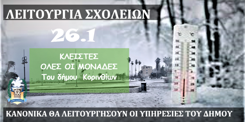 Κλειστές θα παραμείνουν και αύριο Τετάρτη 26 Ιανουαρίου 2022, με απόφαση του Δημάρχου Κορινθίων Βασίλη Νανόπουλου, ΟΛΕΣ οι σχολικές μονάδες του δήμου Κορινθίων (νηπιαγωγεία, δημοτικά, γυμνάσια, λύκεια, παιδικοί και βρεφονηπιακοί σταθμοί). Η απόφαση ελήφθη ως προληπτικό μέτρο έναντι των χαμηλών θερμοκρασιών που θα επικρατήσουν αύριο και οι οποίες καθιστούν δύσκολη την μετακίνηση μαθητών και εκπαιδευτικών και ακόμα δυσκολότερη την παραμονή τους στις αίθουσες με δεδομένη την εφαρμογή των πρωτοκόλλων της πανδημίας και τον συνεχή εξαερισμό των αιθουσών.