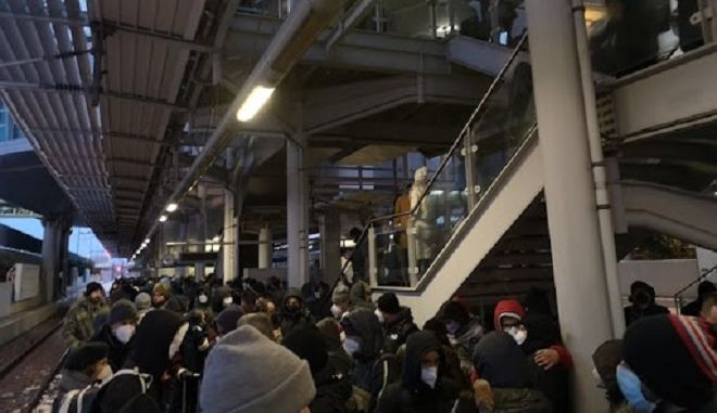 Εξαντλημένοι επιβάτες, προκειμένου να μην χάσουν το μοναδικό -μέχρι στιγμής- δρομολόγιο που θα τους απομακρύνει από το αεροδρόμιο, πήδηξαν στις ράγες και σκαρφάλωσαν στην απέναντι πλατφόρμα.