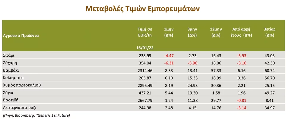 Σύμφωνα με την ανάλυση του ειδικού τμήματος της Τράπεζας Πειραιώς, η διεθνής αγορά των αγροτικών προϊόντων συνεχίζει να καταγράφει υψηλές αποδόσεις για μια ακόμα χρονιά (δείκτης αγροτικών προϊόντων +26,61% το 2021). Οι δυσμενείς καιρικές συνθήκες, το αυξημένο κόστος στις τιμές των λιπασμάτων και πρώτων υλών, η εκτίναξη των διεθνών τιμών ενέργειας, οι σοβαρές ελλείψεις εργατικού δυναμικού και τα προβλήματα στην εφοδιαστική αλυσίδα, εξαιτίας της πανδημίας, δημιούργησαν την τέλεια αγροτική καταιγίδα, ενισχύοντας τις τιμές των τροφίμων στα υψηλότερα επίπεδα της τελευταίας δεκαετίας.