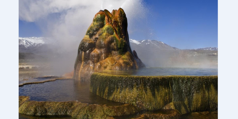 Στην Πολιτεία της Νεβάδα στις ΗΠΑ, το καλειδοσκοπικό Fly Geyser στην Έρημο Black Rock είναι άκρως εκθαμβωτικό και στην ουσία δημιουργήθηκε από ανθρώπινο λάθος, Κατά τη δεκαετία του ’60, μια εταιρία γεωθερμικής ενέργειας έκανε γεωτρήσεις στην περιοχή με την ελπίδα να βρει κάποια αξιοποιήσιμη πηγή ενέργειας. Το νερό το οποίο βρήκαν οι εργάτες δεν ήταν αρκετά ζεστό, οπότε παραιτήθηκαν από την περιοχή, αλλά δεν κατάφεραν να σφραγίσουν καλά τις τρύπες που δημιούργησαν κι έτσι ακόμη και σήμερα το έδαφος πετάει νερό και ατμό, έχοντας δημιουργηθεί θερμοπίδακας, ενώ τα υπέροχα χρώματα έχουν δημιουργηθεί από τα φύκη τα οποία κάλυψαν τα πετρώματα.