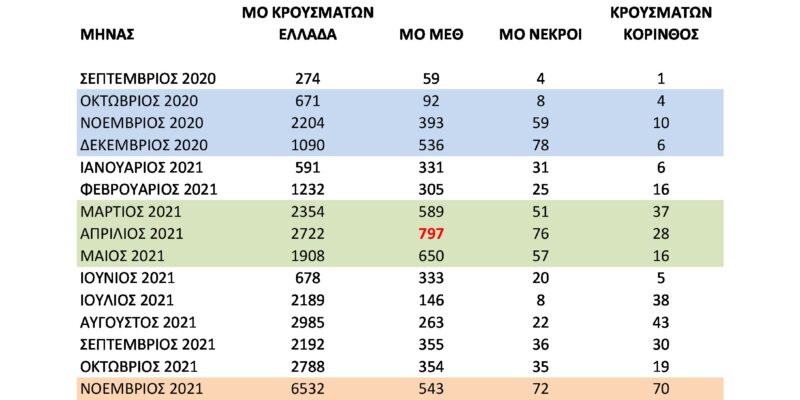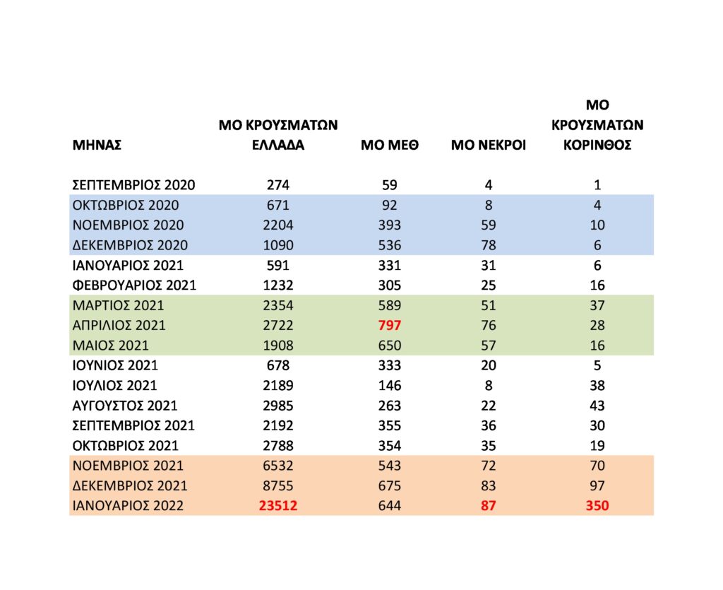 Στην Κορινθία τον Ιανουάριο είχαμε 10.835 κρούσματα όταν σε όλη την πανδημία είχαμε 24.510. Δηλαδή τον Ιανουάριο 2022 στην Κορινθία ανακοινώθηκε το 44% του συνόλου των κρουσμάτων!