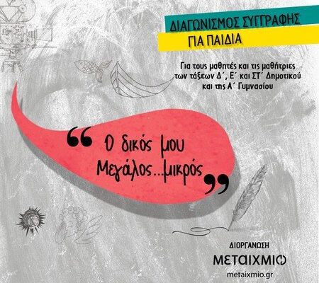 Με αφορμή τα βιβλία της σειράς «Οι Μεγάλοι… μικροί» της πολυβραβευμένης συγγραφέα Αγγελικής Δαρλάση, οι εκδόσεις ΜΕΤΑΙΧΜΙΟ διοργανώνουν διαγωνισμό συγγραφής για μαθητές και μαθήτριες των τάξεων Δ΄, Ε΄ και ΣΤ΄ Δημοτικού και της Α΄ Γυμνασίου με θέμα «Ο δικός μου Μεγάλος… μικρός».