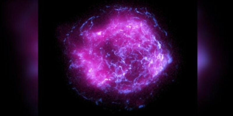 Οι εικόνες προσφέρουν μια άποψη στην Κασσιόπη Α, το διάσημο απομεινάρι μιας supernova ή αλλιώς αστεριού που εξερράγη. Γύρω από τα υπολείμματα του άστρου φαίνονται λαμπερά μωβ σύννεφα αερίου. Αυτά τα σύννεφα δημιουργήθηκαν όταν τα ωστικά κύματα από την έκρηξη προκάλεσαν απίστευτα υψηλές θερμοκρασίες, επιταχύνοντας σωματίδια υψηλής ενέργειας που ονομάζονται κοσμικές ακτίνες.