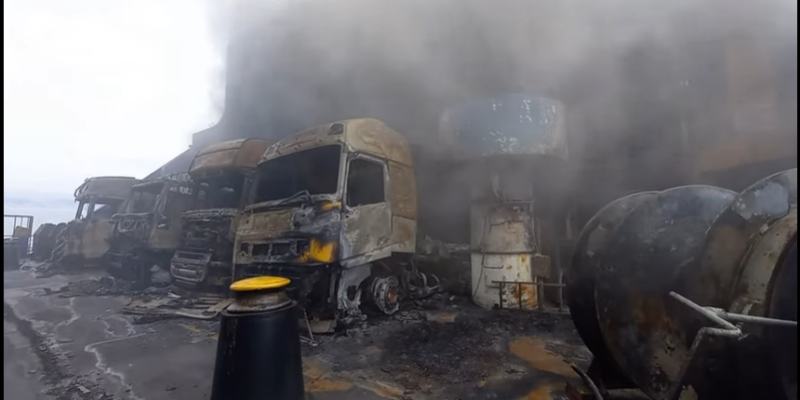 Στα δύο βίντεο που έδωσε η Πυροσβεστική φαίνονται πυροσβέστες μέσα σε ένα σκοτεινό χώρο αλλά και κατεστραμμένα φορτηγά.